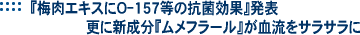 テレビで、農水省の食品総合研究所の発表で、梅肉エキスに新しく「ムメフラール」という成分が発見され、血流をサラサラにする実験放映がありました。